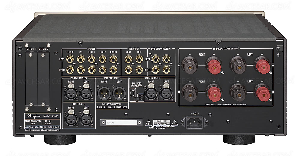 Au programme aussi, la possibilité d'ajouter à l'arrière du E‑650 deux cartes électroniques optionnelles, les Accuphase AD‑50 et DAC‑50. La première est un pré‑ampli Phono MM/MC. Le mode MC fait appel à un montage de type différentiel parallèle de transistors bipolaires. En mode MM, le mode différentiel parallèle est toujours de mise, mais avec des transistors Fet à jonction.