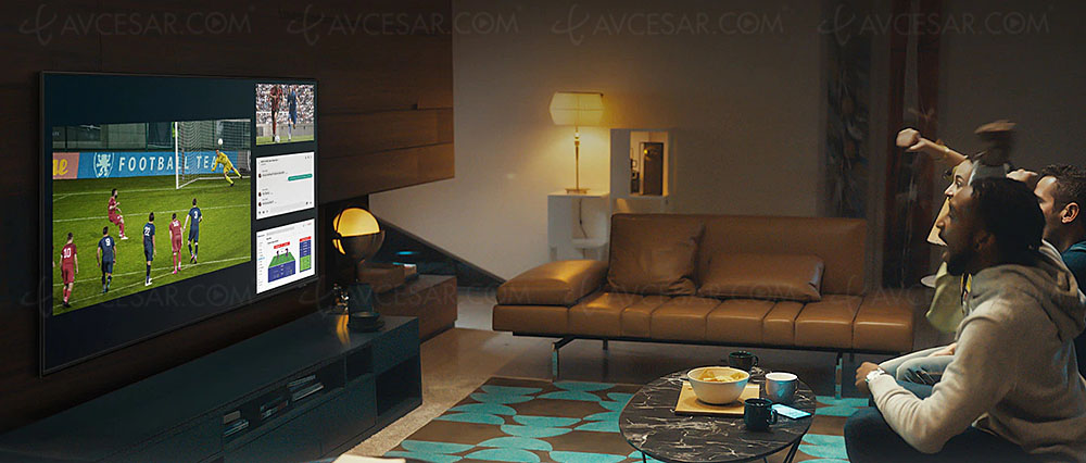 Autre amélioration, les TV QLED Ultra HD 8K Samsung QN800A proposent l'affichage simultané jusqu'à quatre contenus avec la fonction MultiView à travers autant de fenêtres à l'écran : la première avec le signal d'une chaîne TV ou d'une source raccordée au TV, la seconde avec l'écran d'un smartphone de l'utilisateur, la troisième en provenance d'une console de jeu et la dernière avec internet (cf. photo ci‑dessous). Il existe 14 possibilités d'affichage, en passant du classique PIP jusqu'à disposer quatre fenêtres adjacentes.