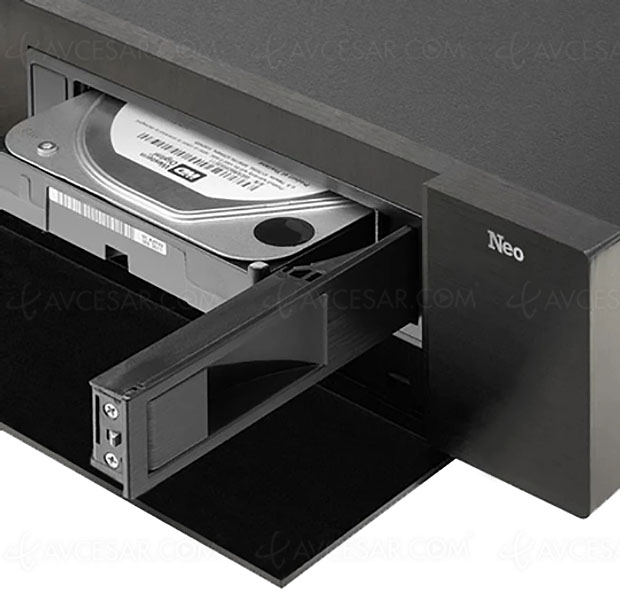 Pour le reste, on retrouve des connecteurs plaqués or, l'excellente télécommande avec des touches d'accès direct au ratio d'image, touche 10s avant/arrière, touche 1 mn avant/arrière (cf. photo ci‑dessus) et un capteur IR ou encore un rack HDD Sata 3,5'' (jusqu'à 20 To) dissimulé derrière la façade.