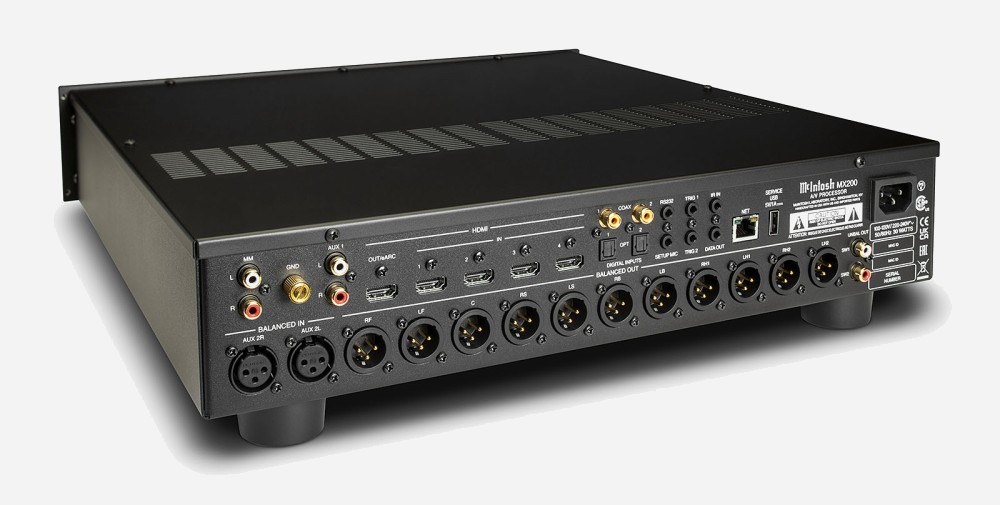 Le McIntosh MX200 n'est donc toujours pas pléthorique en termes de connectique. Mais l'essentiel est préservé avec quatre entrées/une sortie HDMI 2.1 (fonction eARC pour cette dernière), deux entrées coaxiales, deux optiques, une stéréo RCA, une Phono MM, une entrée auxiliaire stéréo RCA et une stéréo XLR. La sortie 11.2 (Dolby Atmos et DTS:X) compte onze XLR (symétriques) plus deux RCA (asymétriques) pour les caissons de basses. On remarque aussi une prise RS‑232, un port Ethernet, un port USB‑A alimenté dédié à la maintenance, une prise Trigger, une prise Data et une prise IR. Pour revenir sur les connecteurs HDMI, HDR10+, HDR Dolby Vision, HDCP 2.3, Rec.2020, 4:4:4, 4K/120 et 8K/60 sont au programme.