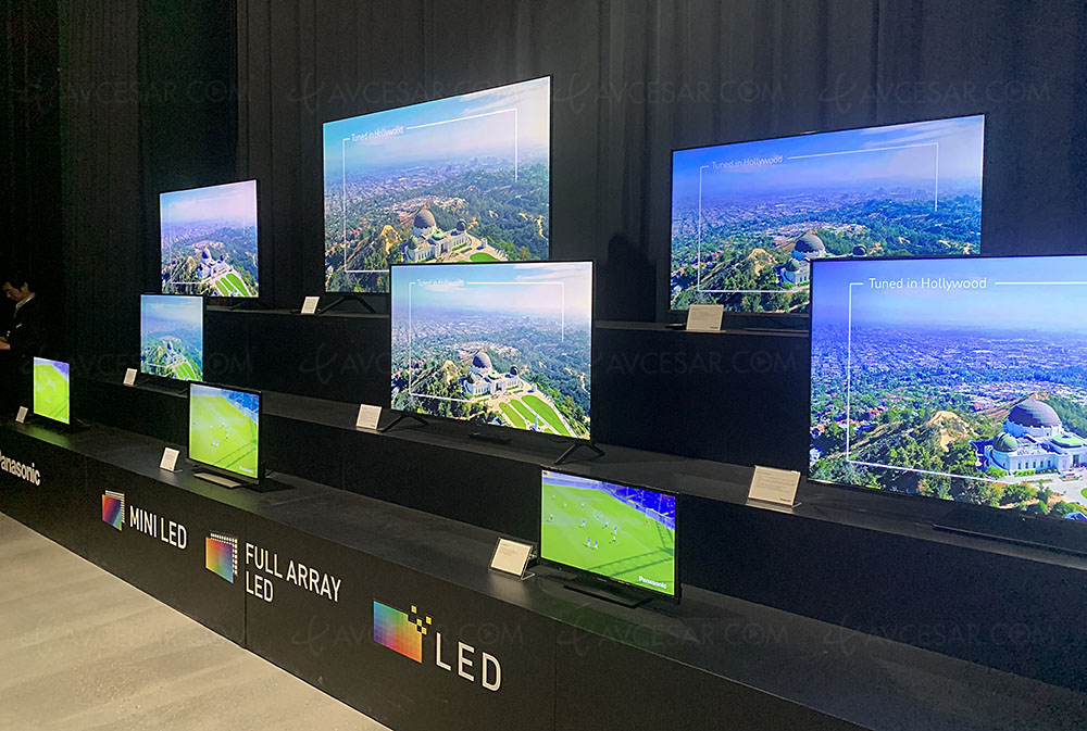 La Panasonic MX950 compte trois références Mini LED Ultra HD 4K, les Panasonic TX‑55MX950 (55'', 140 cm), Panasonic TX‑65MX950 (65'', 165 cm, en haut à gauche sur la photo ci‑dessous) et Panasonic TX‑75MX950 (75'', 191 cm).