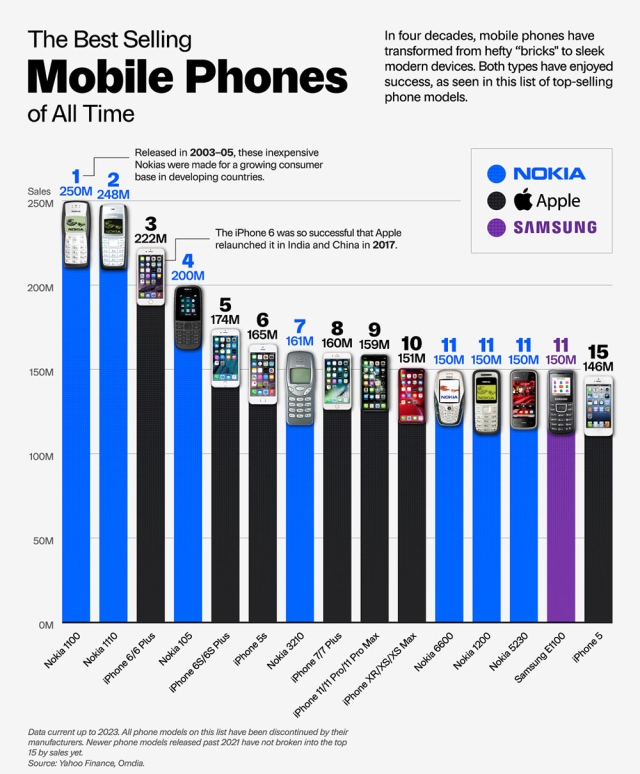 De nombreux modèles de téléphones mobiles ont donc vu le jour au long de ces dizaines d’années, et quand on se demande lequel a le plus été vendu dans le monde, on se penche intuitivement vers les plus récents. Et pourtant… Le site Visual Capitalist a récolté toutes les données nécessaires pour établir un classement des mobiles les plus vendus de tous les temps, et en première position se place… le Nokia 1100. Eh oui, avec 250 millions d’unités vendues dans le monde, l’appareil « vintage » devance tous les iPhone que l'on pensait finir premiers.