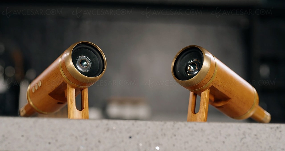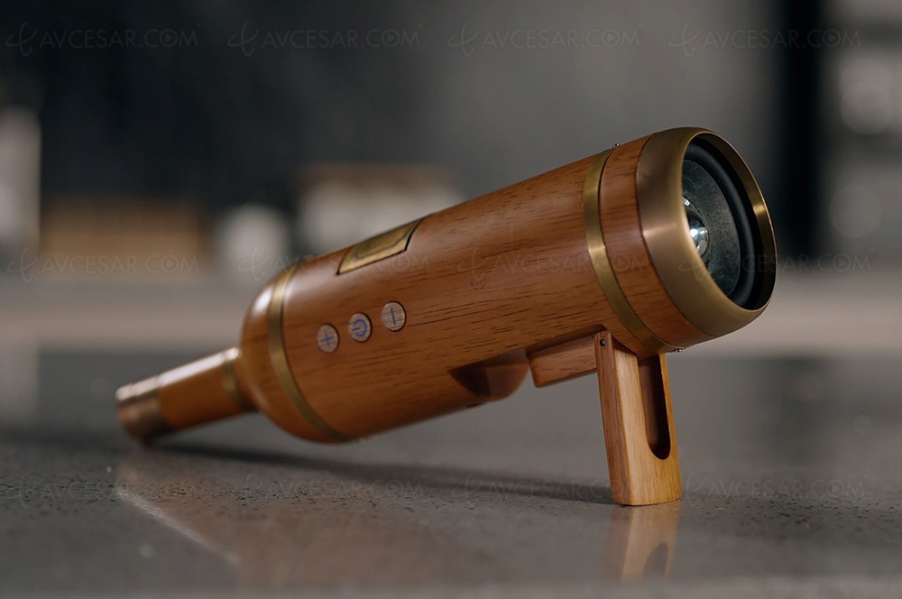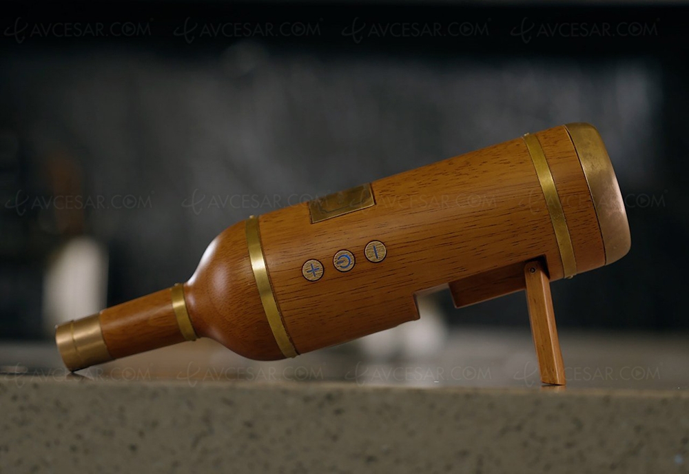 La fabrication en bois de chêne confère immédiatement une apparence noble à l’enceinte, ainsi qu’un son chaleureux et naturel. Outre les inserts en cuivre, on remarque une étiquette « Dream Winery » et d'autres détails comme le bouchon et même des boutons de contrôle sur le côté. Vous pouvez poser la bouteille sur sa base, ou en biais sur un support rétractable.
