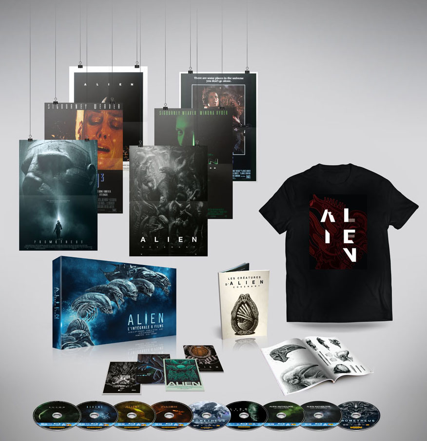 Une édition Collector (photo ci‑dessous) sera également disponible le même jour en exclusivité mondiale. Elle contiendra neuf Blu-Ray (les six films et trois disques bonus), un t‑shirt exclusif, un livret de 40 pages intitulé Les créatures d’Alien Covenant, quatre cartes Mondo et six posters des affiches de cinéma US.