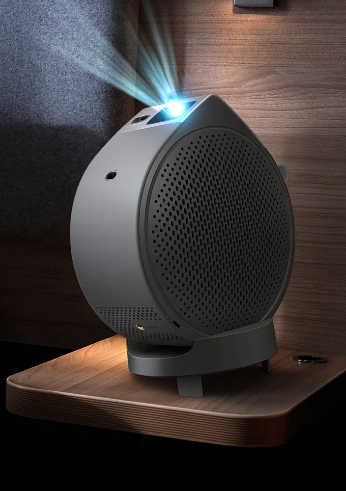 Parmi ses caractéristiques principales, il faut mentionner une puce DLP 0,23" (0,58 cm) de résolution Full HD 1 080P, la compatibilité HDR 10 et une source lumineuse monolaser bleu capable de délivrer jusqu'à 500 lumens. Côté image toujours, un angle de projection vertical à 135° et un angle horizontal à 360° sont de mise. La mise au point et la correction de trapèze (vertical ± 20° degrés, horizontal ±30°), sont automatiques et leratio de projection affiche 1.2. Côté audio, un mode audio Projection plafond est présent afin de créer un environnement spatial à l'instar du Dolby Atmos. À savoir, le pied ajustable de 10° pour disposer d'une image parfaitement centrée dans l'axe d'un lit par exemple lors d'une projection plafond (cf. photos ci‑dessous à gauche et en haut de cette actualité). Le BenQ GV50P peut aussi faire office d'enceinte Bluetooth 5.0 et le système 2.1 embarqué restitue une puissance de 18 watts.