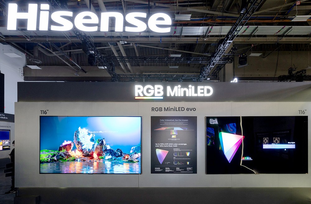 Un nouveau champ de bataille synonyme d'innovation technologique ouvert par le constructeur Hisense en 2025 avec la technologie RGB Mini LED et sur lequel la firme chinoise compte bien garder le leadership avec l'annonce cette année de l'ajout d'une quatrième couleur dans ses systèmes de rétroéclairage premium, celui des TV RGB Mini LED Evo Hisense 116UXS (cf. notre actualité CES 26 > RGB Mini LED Evo 4 primaires : Hisense veut nous en faire voir de toutes les couleurscf. photo ci‑dessous) et Micro LED Hisense 163MXS (cf. notre actualité CES 26 > Hisense 163MXS : premier Micro LED 4 primaires (RGBY) pour 100% BT.2020).