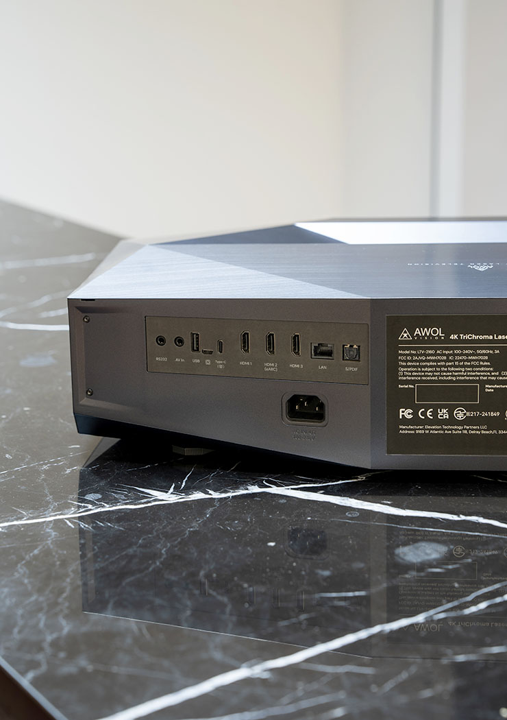 Architecturée autour de la technologie propriétaire PixelLock, un moteur optique hybride (optique, mécanique et numérique) nouvellement développé et d'une série d'optimisations matérielles, la gamme Aetherion est conçue pour repousser les limites des vidéoprojecteurs ultracourte focale, le manque de précision sur les très grandes tailles d'image. Ainsi, Awol assure un alignement parfait des pixels (absence de franges colorées) même sur une image géante de 200" (508 cm) pour une netteté sur toute la superficie de l'image en progrès sensible. Pour y parvenir, Awol utilise pour la première fois un bloc optique Sapphire-Series avec des lentilles avec revêtement DLC (Diamond‑Like Carbon). Résultat ? Une transmission lumineuse record de 99,97% et une réduction drastique des réflexions parasites. Important, il faut aussi mentionner un capuchon de lentille motorisé pour préserver sa clarté de la poussière et l'emploi d'une puce DLP 0,47 pouces.