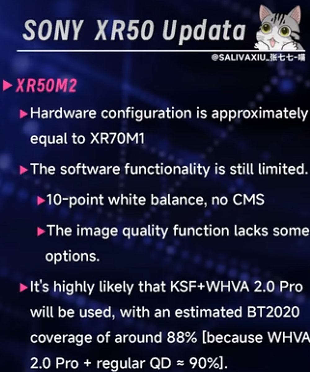 Enfin, la série TV Sony Bravia 5 II hériterait des caractéristiques techniques de la Sony Bravia 7 millésime 2025, sans toutefois le pic lumineux de cette dernière (cf. la capture publiée dans notre actualité CES 26 > TV Mini LED Sony Bravia 8 II 2026, premières rumeurs). Salivaxiu ajoute que la dalle serait d'obédience WHVA 2.0 avec système de rétroéclairage KSF, pour une couverture Rec.2020 aux environ de 88%.