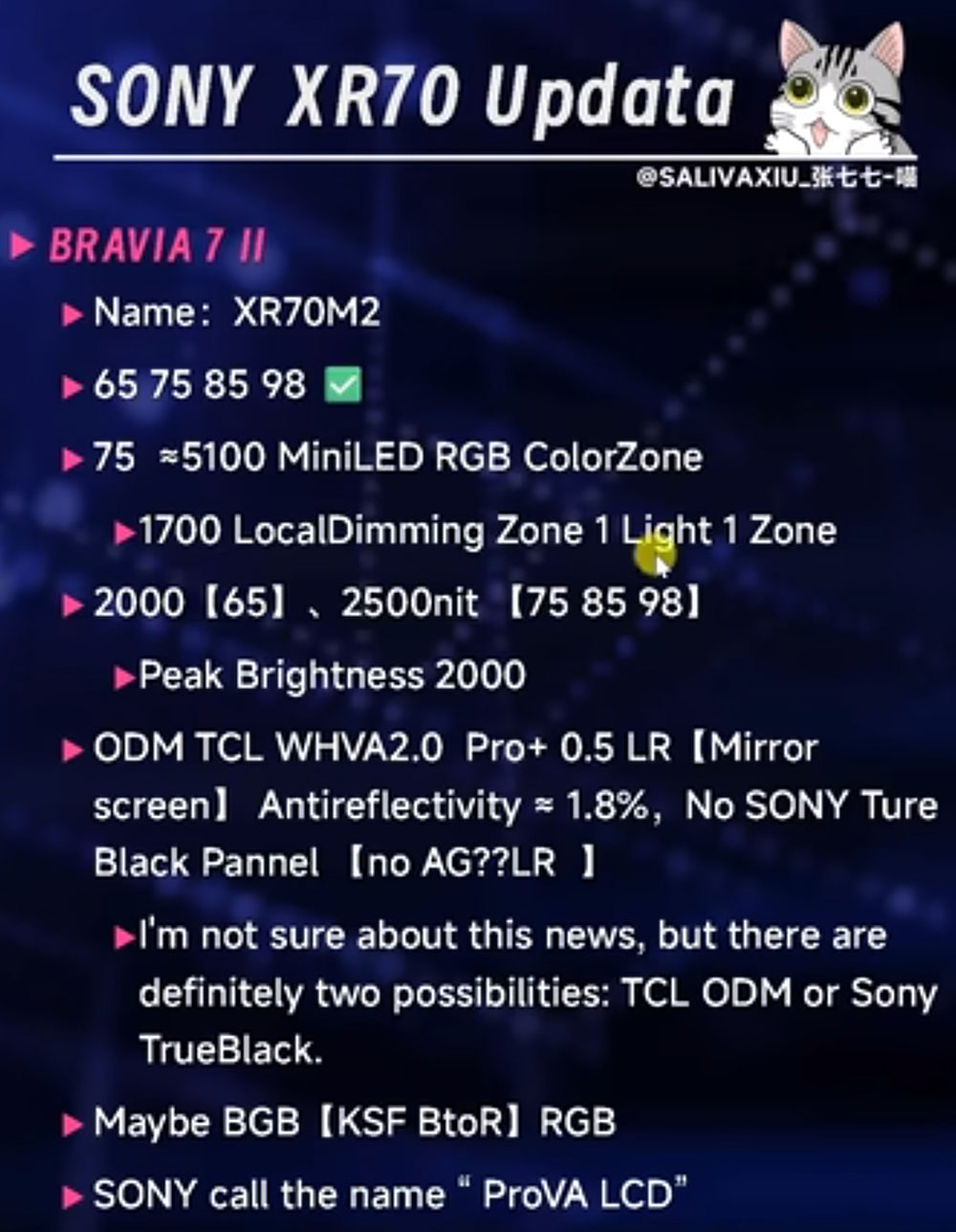 Si l'on se fie aux annonces au « fuiteur » chinois de Salivaxiu_Zhang Qiqi‑Miaou, la série Sony Bravia 7 II compterait quatre références correspondant aux diagonales 65", 75", 85" et 98 pouces. On apprend que le spécimen 75" embarque un système de rétroéclairage doté de 5 100 zones Mini LED RGB ramené à un total de 1 700 zones individuelles (5 100/3 au regard des triplets RGB) dotées d'une LED (contre 4 par zone sur le Bravia 9 II). Pour le reste, pas d'évolutions, le pic lumineux est annoncé à 2 000 nits sur le 65", 2 500 nits sur les deux autres.