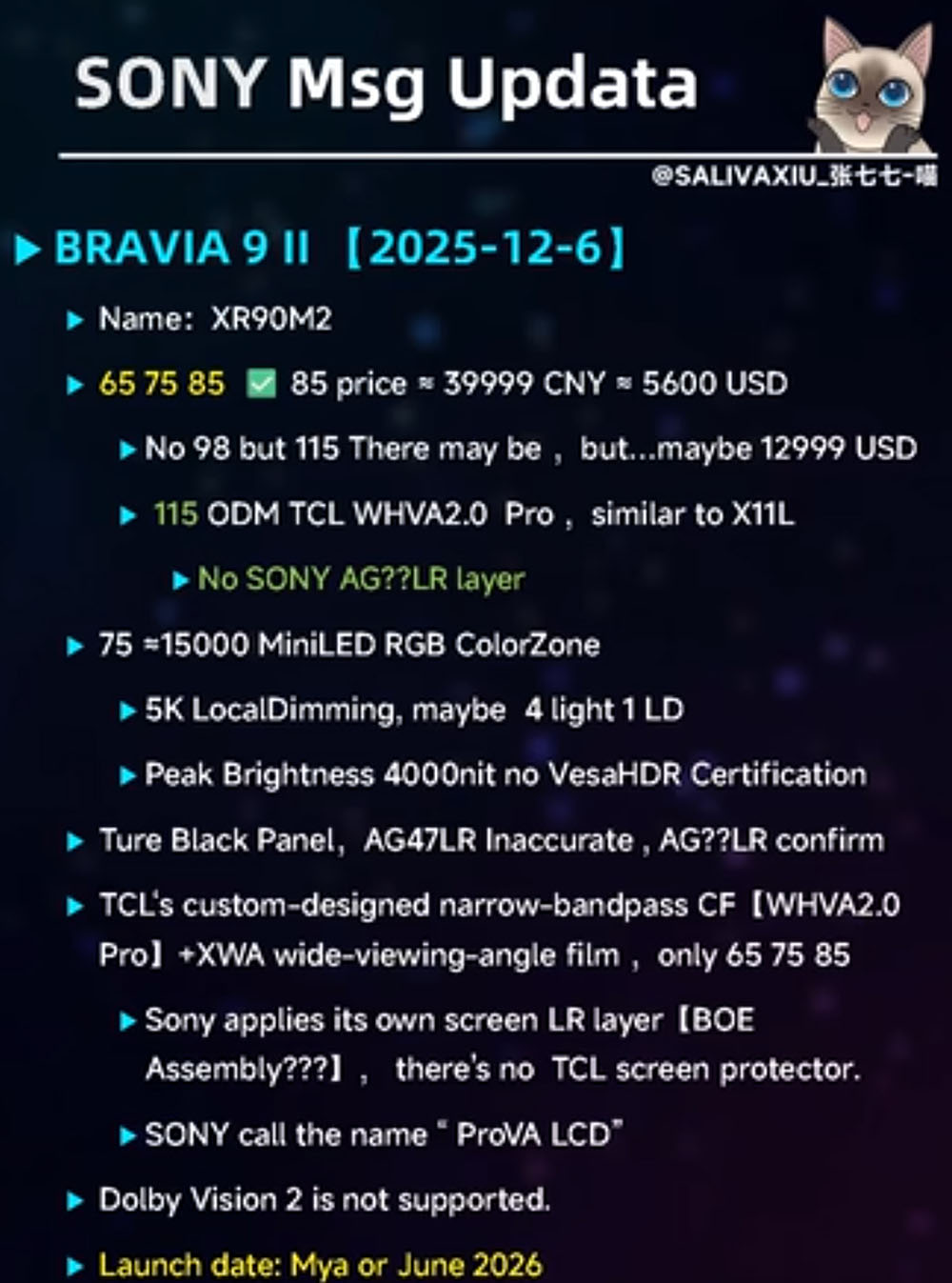 Si l'on se fie aux annonces au « fuiteur » chinois de Salivaxiu_Zhang Qiqi‑Miaou, la série Sony Bravia 9 II compterait désormais quatre références correspondant aux diagonales 65", 75", 85" et le 115", le 98" disparaîtrait donc de la série :