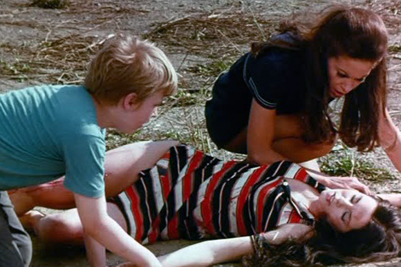À noter, la référence à la « Manson family » lorsque, dans une scène de torture, l’un des membres du groupe grave « pig » avec un couteau sur la jambe de son acolyte. L’idée d’un Mal qui se transmet évoque bien évidemment les thématiques chères au cinéma de George Romero. Ce n’est d’ailleurs pas un hasard si I Drink your Blood (1970) fut réalisé entre Night of the Living Dead (1968) et The Crazies (1973).