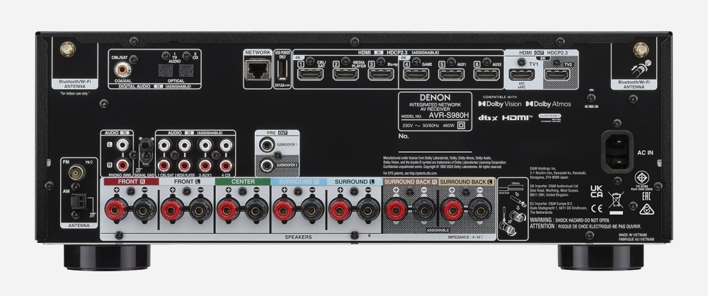 Comme déjà évoqué, si l'AVR‑S950H proposait huit entrées HDMI 2.0b, dont une en façade, et deux sorties HDMI, l'AVR‑S980H réduit légèrement le nombre d’entrées à six mais trois d'entre elles sont d'obédience 2.1, gage de pérennité. On remarque toujours deux sorties caisson de basses, une entrée Phono, deux entrées optiques, une coaxiale, une entrée Phono, quatre entrées stéréo RCA, le port USB en façade, un port Ethernet et sept borniers vissants.