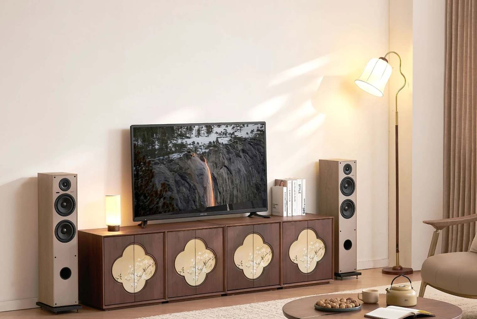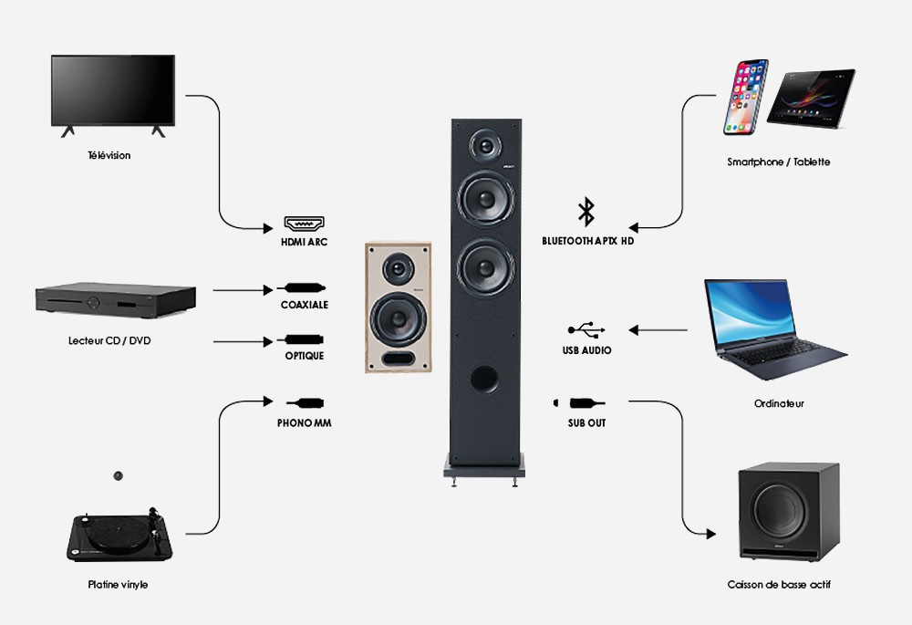 Avec ses deux médiums‑boomers 13 cm et son volume de charge supérieur, la Horus 11F Active BT descend à 40 Hz, offrant une assise plus confortable pour un usage Hi‑Fi ou TV. Et l’entrée HDMI ARC déjà mentionnée permet une intégration discrète de part et d’autre d'un diffuseur, sans barre de son ni amplificateur.