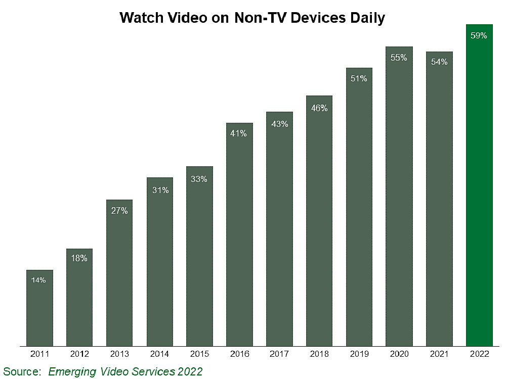 « Près de 60% (NDLR : cf. visuel ci‑dessus) des adultes regardent désormais quotidiennement des vidéos sur un appareil autre que le téléviseur, note Bruce Leichtman, président et analyste principal de LRG. Cela inclut la moitié de tous les adultes qui regardent des vidéos sur un téléphone mobile tous les jours, contre un tiers des adultes il y a cinq ans. Bien que les appareils autres que le téléviseur offrent la possibilité de regarder des vidéos n'importe où, l'endroit le plus courant pour regarder des vidéos sur ces derniers reste la maison. 82% de ceux qui regardent des vidéos sur un téléphone mobile et 85% de ceux qui regardent des vidéos sur une tablette ou une liseuse le font à la maison ».