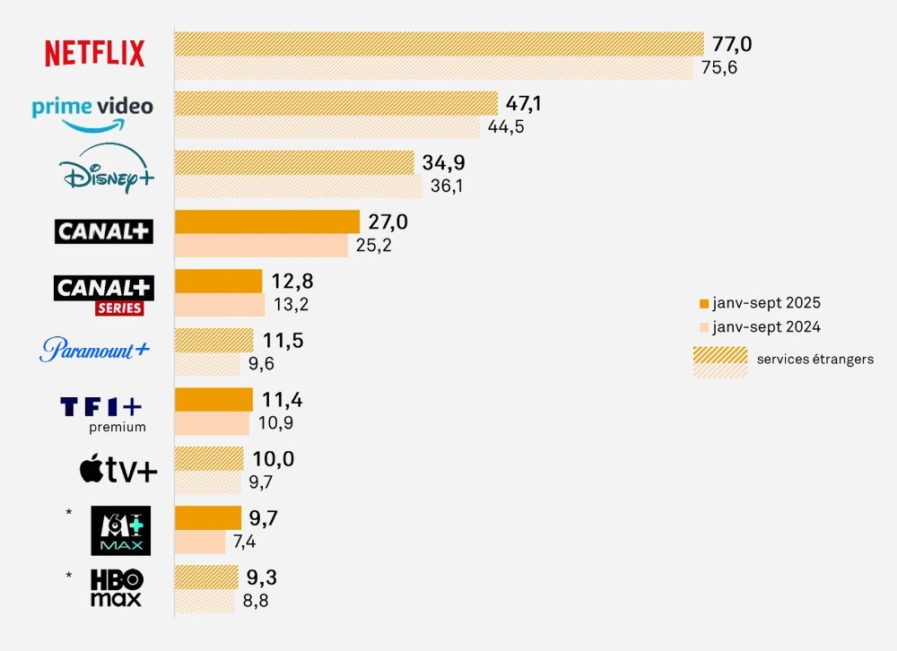 86% du marché est accaparé par les plateformes SVOD des géants du secteur. Précision, Netflix, Prime Video et Disney+ représentent à eux seuls 2,5 milliards de la somme mentionnée. Canal+ et Canal+ Series sont en 4e et 5e places, suivis par Paramount+, TF1+ Premium, Apple TV, M6+Max et HBO Max.