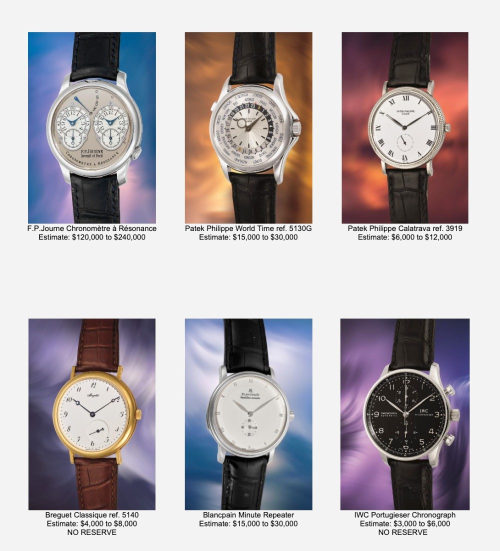 Les autres pièces incluent deux Patek Philippe, une autre F.P. Journe, une Blancpain Minute Repeater, une Breguet Classique, et une IWC Chronograph, pour des estimations allant de 3 000 à 240 000 dollars.