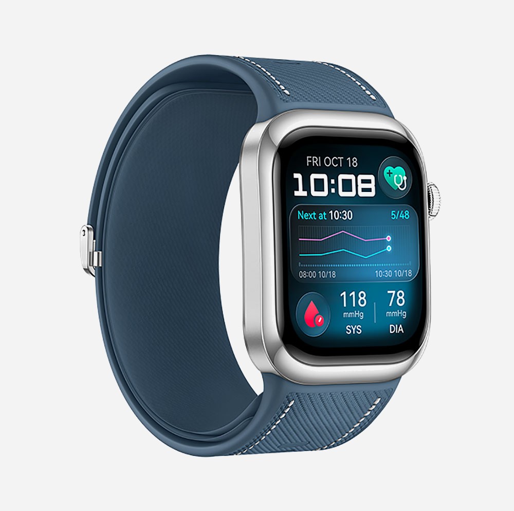 Coup d’œil maintenant sur la Huawei Watch D2, modèle centré sur le suivi de la santé, se distinguant notamment par l’intégration de technologies de pointe pour le suivi de la tension artérielle et la détection des arythmies. À noter aussi la surveillance ambulatoire de la tension artérielle sur 24 heures (même pendant le sommeil et les activités quotidiennes) afin de détecter des données de tension difficiles à capter (cf. photo ci‑dessous). La technologie Huawei TruSense est naturellement de la partie, et Huawei peut se vanter d’avoir ici la première montre connectée au monde à obtenir à la fois l’enregistrement en tant que dispositif médical de classe II auprès de la NMPA en Chine et la certification CE MDR de l’UE pour la surveillance ambulatoire de la tension artérielle au poignet.