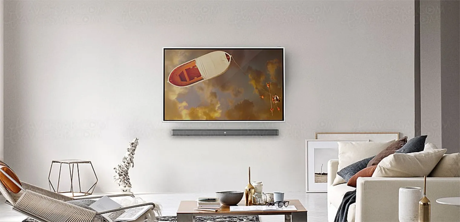 Plus particulièrement destiné aux téléviseurs de 55'' (140 cm) à 65'' (165 cm), le gabarit de la barre sonore, plus long, permet d'embarquer plus de haut‑parleurs. On compte ainsi trois tweeters de 3,2 cm et six médiums‑graves de 5,7 centimètres. Le caisson, quant à lui, dispose d'un boomer de 25,5 centimètres.