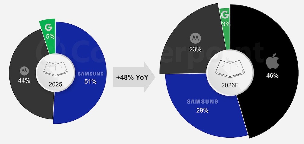 Le cabinet Counterpoint Research prédit ainsi que l’iPhone Ultra sera leader du marché américain dès 2026, capturant 46% du marché et reléguant le leader actuel Samsung à 29%. Pour comparaison, en 2025, Samsung détenait 51% du marché, suivi de Motorola (44%) et Google (5%). Au passage, Counterpoint Research estime que le marché du pliable va faire un bond de 48% en 2026 par rapport à 2025, essentiellement grâce à l’arrivée d’Apple.