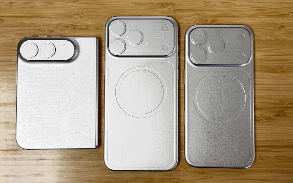 C’est le « fuiteur » Vadim Yuryev qui publie ces nouvelles images volées, montrant côte à côte des maquettes des iPhone 18 Pro Max, iPhone Ultra et iPhone 18 Pro. On peut également voir l’appareil en mode plié (photo en tête d’article), ainsi qu’en version dépliée sous un iPhone 17 Pro Max, permettant de se rendre compte de la taille de l’écran principal (7,8"), aussi large que la longueur de l’iPhone normal, et plus haut (111,5 mm contre 71,5 millimètres).