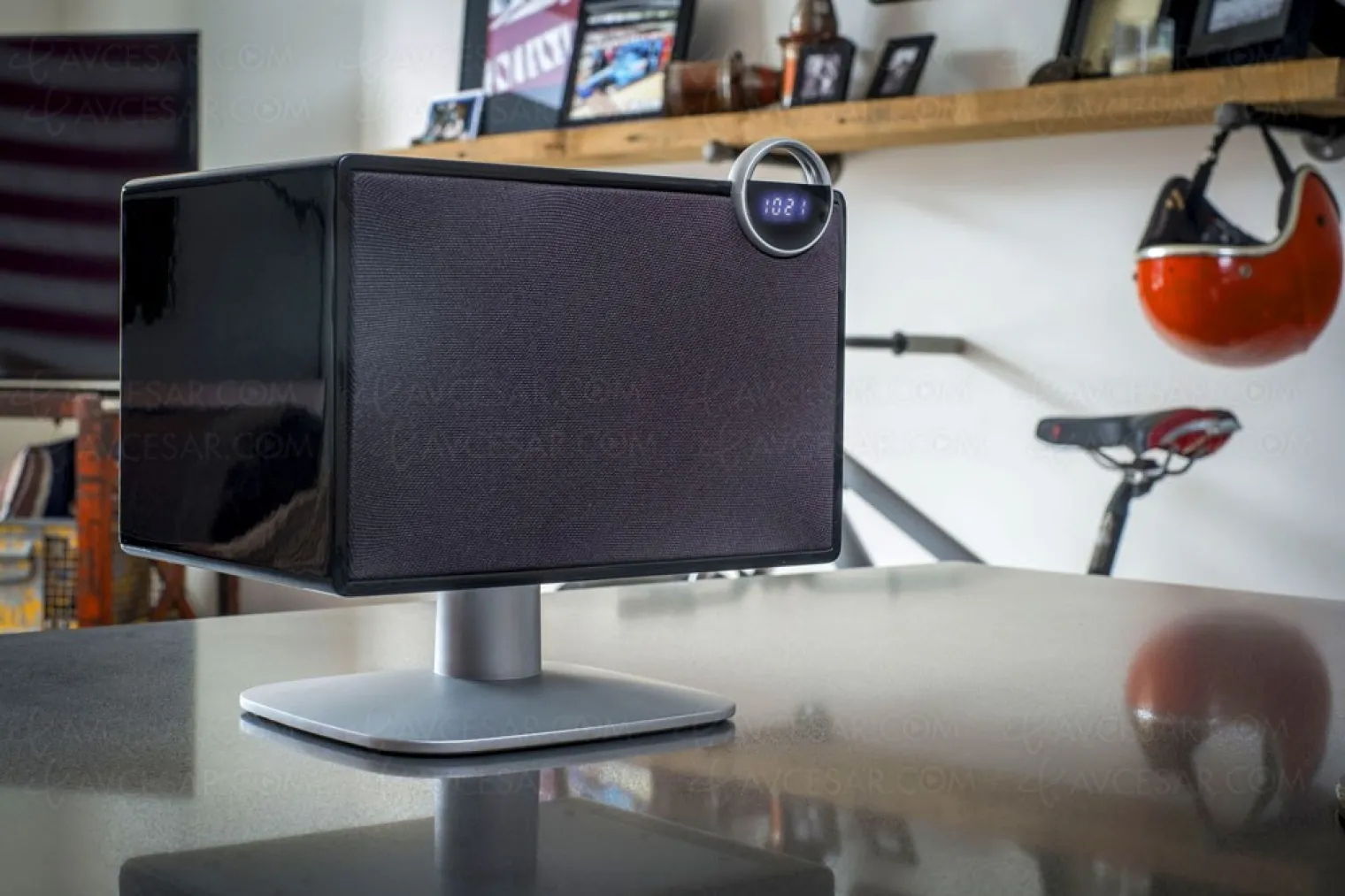 La Jamo DS6 se présente donc sous la forme d'un cube au design néo‑rétro plutôt réussi. Une horloge est présente via un afficheur dans un cercle argenté émergeant sur le coin supérieur droit de l'enceinte, du plus bel effet. Ce dernier, en plus d'afficher l'heure, renseigne aussi sur la source audio ou sur la station de radio en service. Dernière précision sur l'esthétique de la Jamo DS6, sa finition est proposée en noir, blanc ou vert olive.