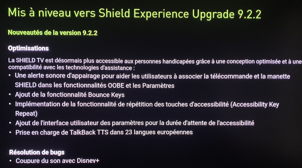 La mise à jour Shield Experience 9.2.2 apporte plusieurs corrections de stabilité et de fonctionnement, nVidia visant notamment les problèmes audio qui affectaient certains flux Disney+, en particulier en Ultra HD 4K. L’objectif est de résoudre les coupures, désynchronisations ou comportements erratiques rapportés par les utilisateurs sur le service de streaming de la firme aux grandes oreilles.