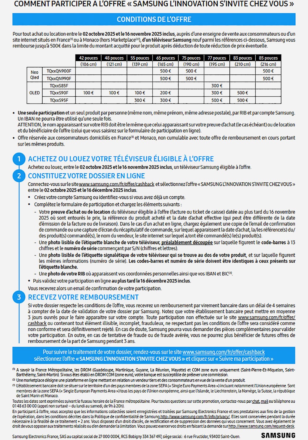 Plus de détail sur l'offre dans les magasins participants ou sur le site internet de la marque : www.samsung.com/fr/offer/cashback
