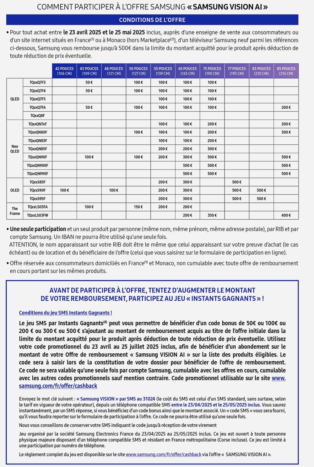 À savoir, avant de participer à l'offre de remboursement intitulée « Samsung Vision AI », tentez d'augmenter son montant de 50 €, 100 €, 200 €, 300 € ou 500 € en participant au jeu « Instants gagnants » (modalités à découvrir ci‑dessus). Plus de détail sur l'offre dans les magasins participants ou sur le site internet de la marque : www.samsung.com/fr/offer/cashback