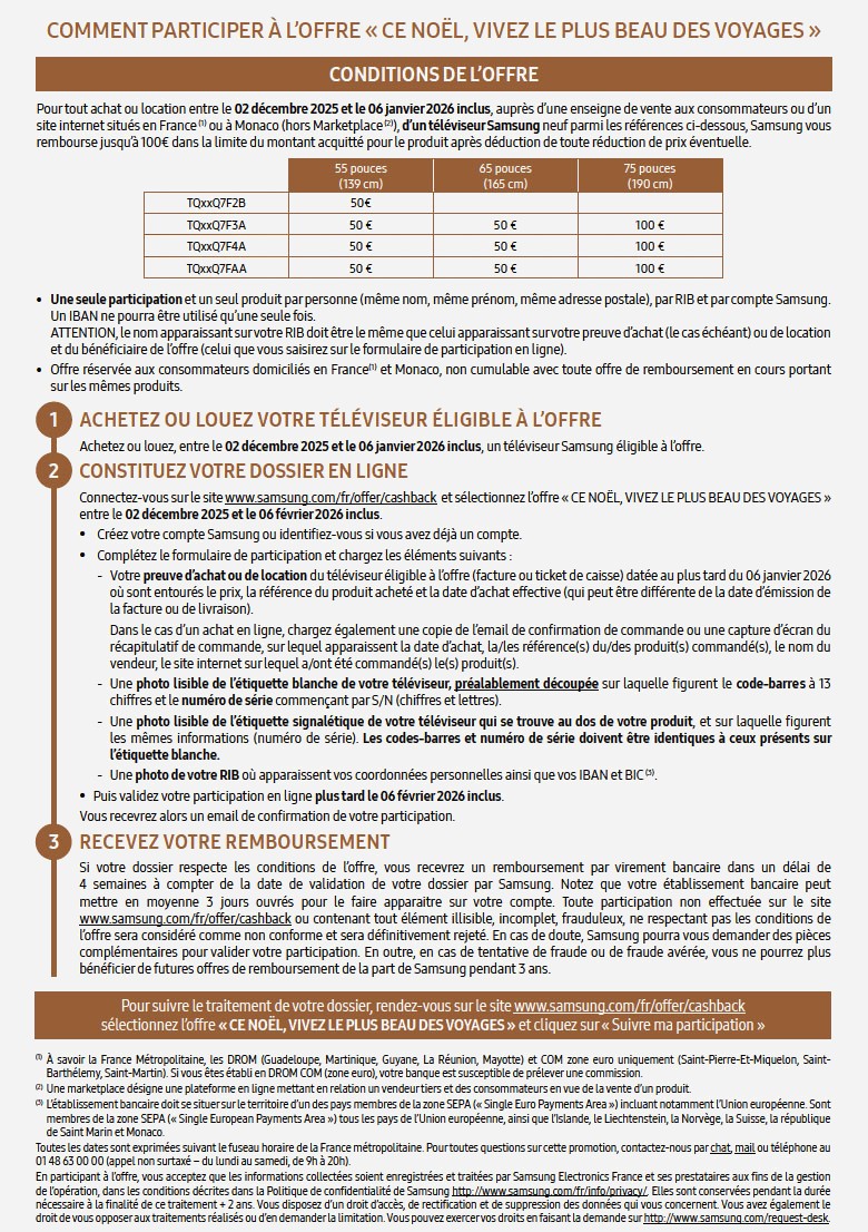 Plus de détail sur l'offre dans les magasins participants ou sur le site internet de la marque : www.samsung.com/fr/offer/cashback