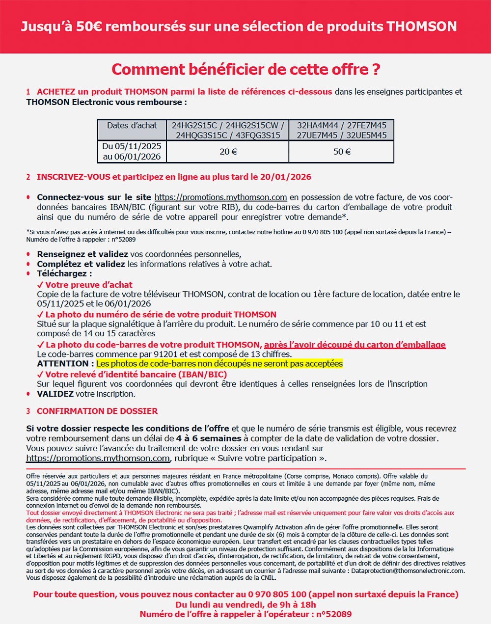 Le détail de l'offre est disponible sur le site internet de la marque : Promotions Thomson