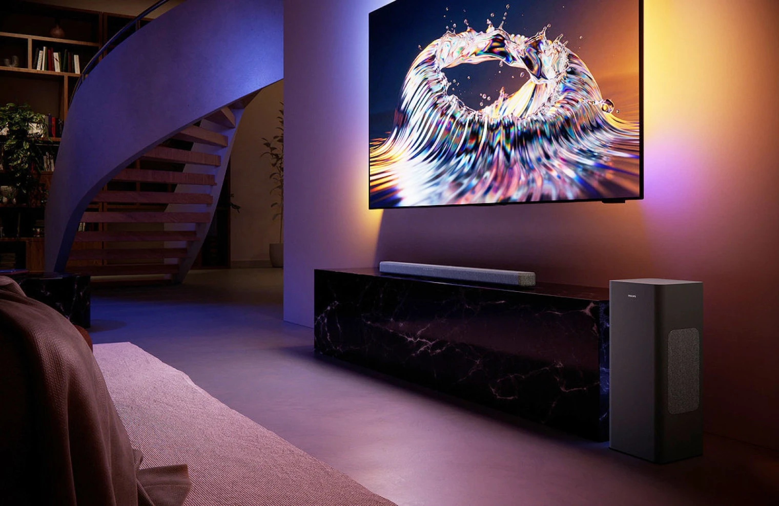 Le traitement IA Intellisound adapte automatiquement le rendu sonore selon le contenu (film, musique, jeu), avec Voice Boost, Spatial Audio et des réglages personnalisables. Enfin, la compatibilité EasyLink 3.0 permet un contrôle unifié avec un téléviseur Philips via une seule télécommande.