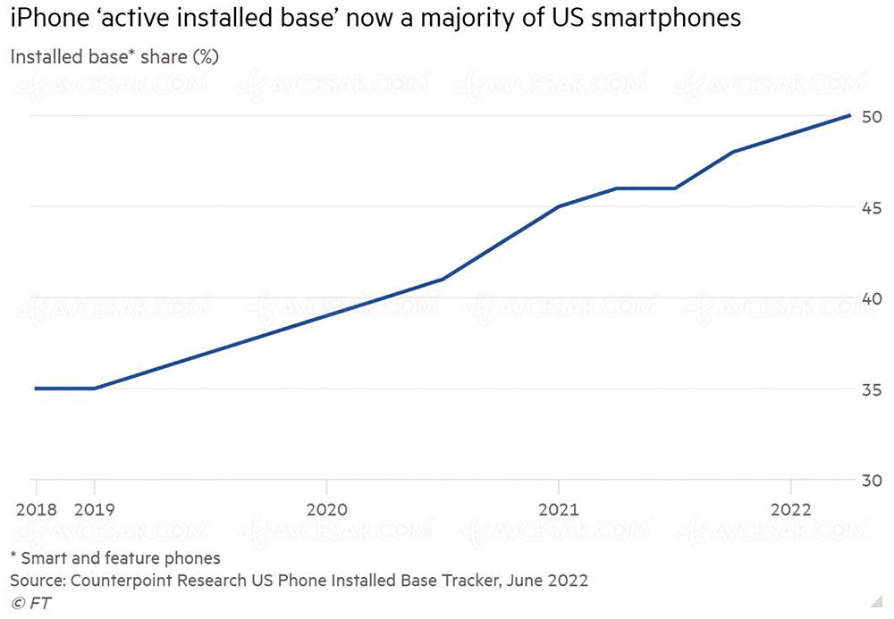 Selon les derniers chiffres du cabinet Counterpoint Research (via Financial Times), la proportion de possesseurs d’iPhone aux États‑Unis est récemment passée au-‑dessus de 50%, le reste du marché étant occupé par les modèles Android.