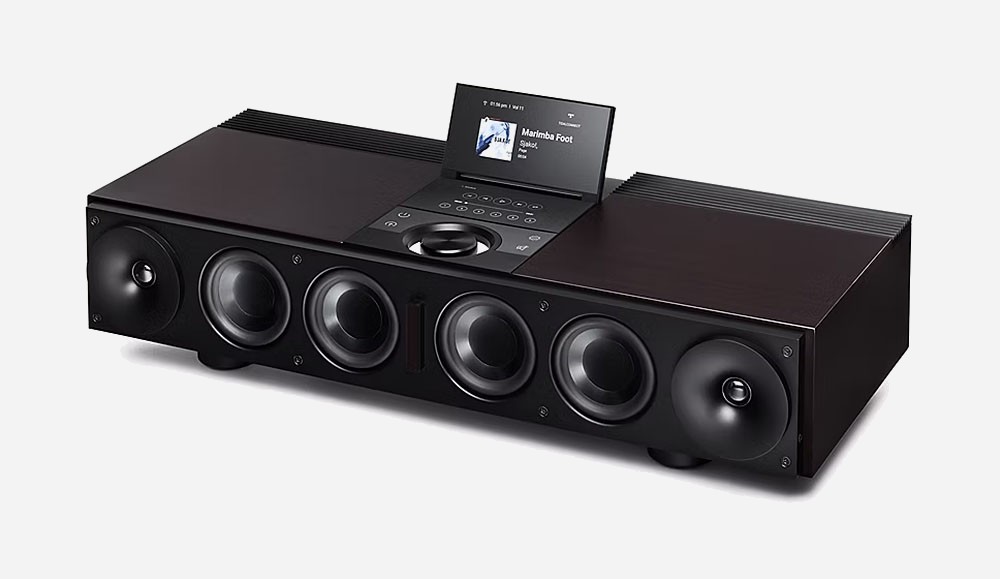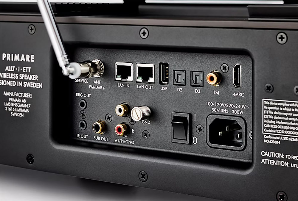 Côté acoustique, Primare n’a pas fait les choses à moitié : l’Allt‑i‑Ett intègre six boomers 10 cm (avant, arrière et vers le bas), deux médiums 10 cm et deux tweeters à guide d’ondes 20 mm, le tout alimenté par une amplification numérique 300 watts. L’objectif affiché est d’offrir un grave ample, une scène sonore large et une dynamique proche d’un système Hi‑Fi séparé, avec en renfort une sortie subwoofer dotée d’une vraie gestion de basses pour épauler un caisson dans les pièces de grande taille.