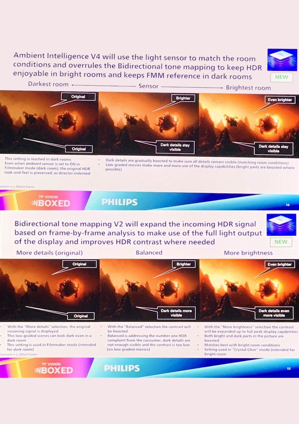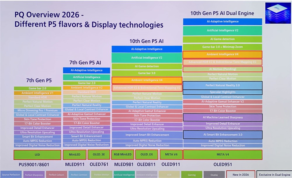 Cette variante à double processeur embarque plusieurs fonctionnalités inédites qu'aucun autre modèle de la gamme ne propose : l'algorithme Perfect Natural Reality 3.0, le procédé Specular Highlights pour une restitution plus précise des zones de forte luminosité ou bien l'AI Smart Bit Enhancement 3.0 et l'AI Motion, encore annoncé comme en cours de finalisation. Un module d'intelligence artificielle quatrième génération est présent également contre la V2 sur les autres modèles 10e génération. Bien sûr, on retrouve deux autres fonctionnalités inédites de la puce P5 10e génération, les Advanced HDR V2 avec Bidirectional Tone Mapping V2 et l'Ambient Intelligence V4.