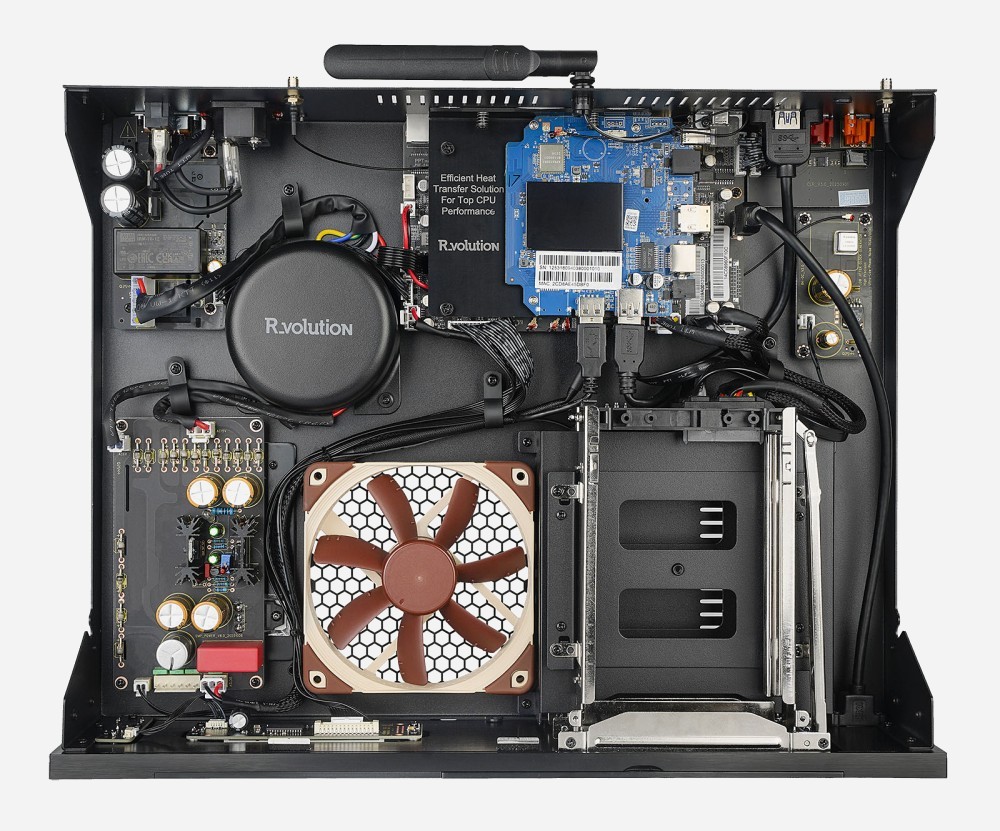 Pour le reste, on retrouve les spécifications du R_volution PlayerPro 8K. En premier lieu, un double emplacement destiné aux disques durs Sata 3,5'' 64 To pour une capacité totale de stockage de 128 To au moment d'écrire ces lignes. On trouve aussi une alimentation de type linéaire sophistiquée basée sur un transformateur toroïdal massif et une horloge interne de compétition TCXO 24 MHz (multiple parfait de 48 kHz pour l'audio et 24 Hz pour la vidéo). Ainsi, les qualités image et son s'en ressentent favorablement, aussi bien pour la lecture des fichiers Iso Blu‑Ray 4K, MKV 4K mais aussi pour les contenus des services de streaming.