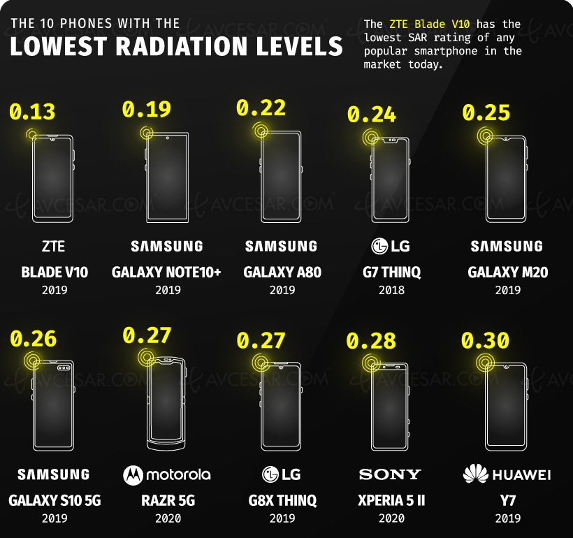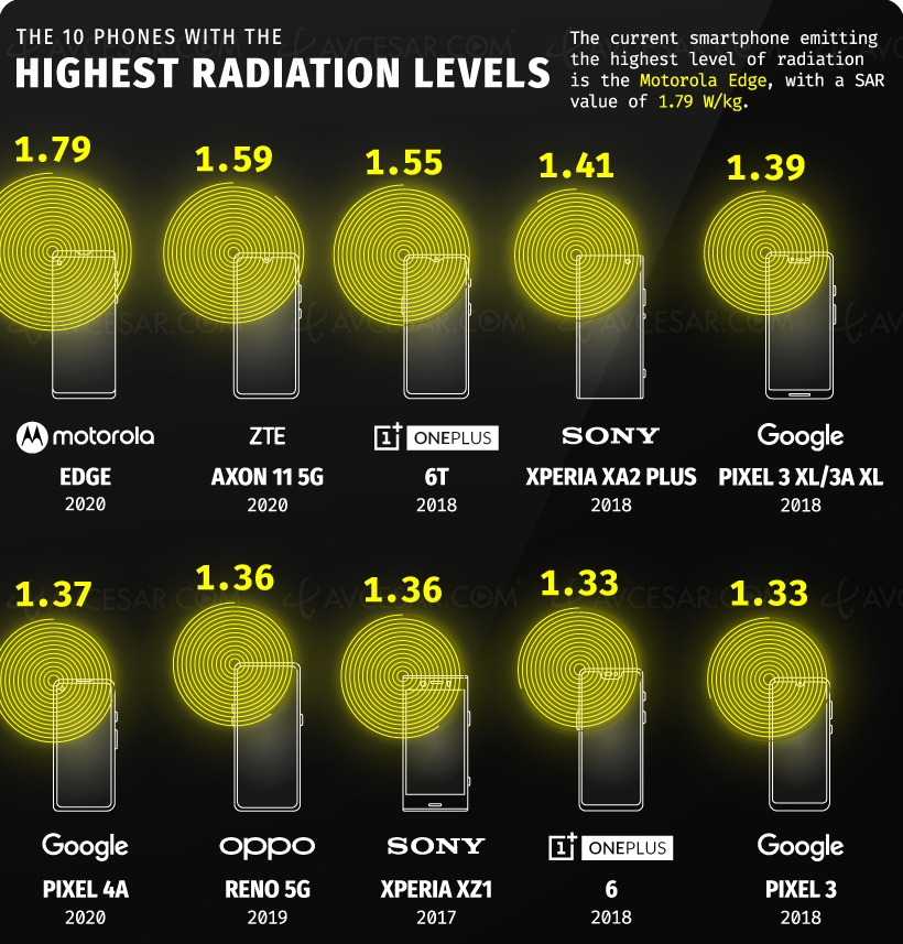 Sur la base de données générée par le Bureau fédéral Allemand de la protection contre les radiations, le site Visual Capitalist a illustré le SAR des smartphones les plus populaires (cf. image en bas de notre article), ainsi que le Top 10 des mobiles émettant le plus de radiations (cf. image ci‑dessus), et le Top 10 de ceux qui en émettent le moins (cf. image ci‑dessous).
