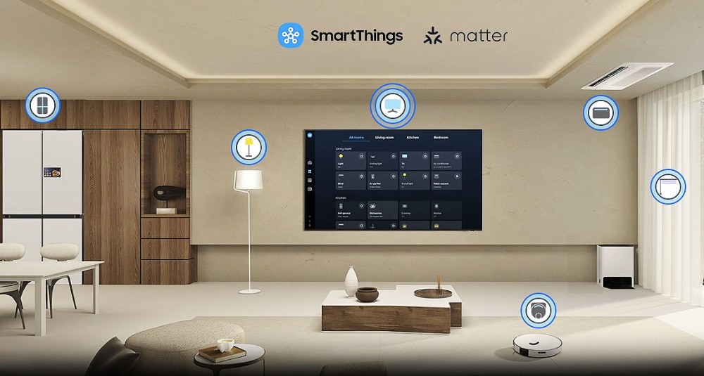 Bien sûr, la fonction SmartThings est toujours de la partie. La plateforme IoT (Internet of Things ou internet des objets) du groupe est compatible Android et iOS ainsi qu'avec plusieurs centaines d'appareils d'autres marques (caméras de surveillance type Arlo, enceintes intelligentes type Amazon Echo ou Google Home, lumières connectées type Philips Hue, serrures connectées…). Les Smart TV Samsung sont ainsi capables de s'insérer dans les écosystèmes interactifs les plus actuels avec un atout de taille, directement lié à leur ADN : la possibilité d'afficher sur leur écran moult informations. Grâce à la nouvelle Vue Carte 3D, il est possible de visualiser le visage de la personne qui vient de sonner à la porte d'entrée, le contenu du réfrigérateur Samsung Family Hub, les notifications de l'aspirateur robot ou encore du lave‑linge lorsque le cycle est terminé. Le téléviseur devient ainsi l'interface privilégiée d'accès aux fonctionnalités proposées par les équipements Smart Home.