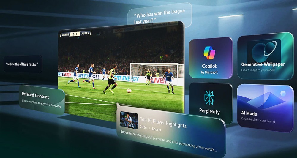 Côté Smart TV, les Samsung S99H bénéficient de la dernière version de Tizen 2026, toujours centrée sur les contenus et toujours accompagnée de 7 ans de mises à jour de l’OS, un engagement rare sur le marché. Les assistants vocaux Bixby, Amazon Alexa et Google Assistant sont intégrés, avec la possibilité de passer de l’un à l’autre selon les usages. Le téléviseur embarque également le nouveau Vision AI Companion, capable de recommander des contenus, d’optimiser image et son en temps réel, de traduire instantanément en six langues ou encore de générer un fond d’écran personnalisé. Les compatibilités AirPlay, SmartThings, Google Meet, Copilot et Perplexity enrichissent encore l’écosystème connecté. La connectivité progresse elle aussi avec le Wi‑Fi 6E, le Bluetooth 5.3.