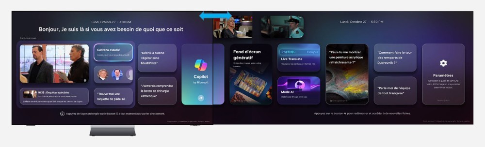 Une question sur le film ou la série en cours ? Il suffit d’appuyer sur le bouton dédié de la télécommande (touche 4 étoiles) et le TV délivre la réponse. Celle‑ci, visuelle, contextuelle et illustrée de contenus et d’informations complémentaires, est proposée à travers un portail spécifique (cf. illustrations ci‑dessous). Le Samsung Vision AI Companion ne se limite pas à fournir une simple liste de résultats : il engage la conversation, suit vos questions annexes et propose même d’organiser vos prochaines vacances à partir d’un lieu aperçu à l’écran. Basculez instantanément entre recommandations personnalisées, réservation d’hôtels, météo ou, pendant une émission culinaire, suggestions de recettes en toute spontanéité.