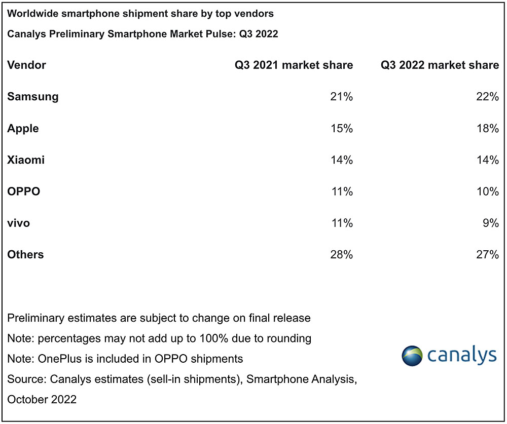 Selon les chiffres du cabinet Canalys, comme pour les six premiers mois de l'année, le marché mondial du smartphone est en décroissance au troisième trimestre 2022, avec 9% de distribution en moins qu’à la même période l’année dernière. C’est aussi la troisième année consécutive que ce trimestre est en baisse, il s’agit même du pire troisième trimestre depuis 2014.