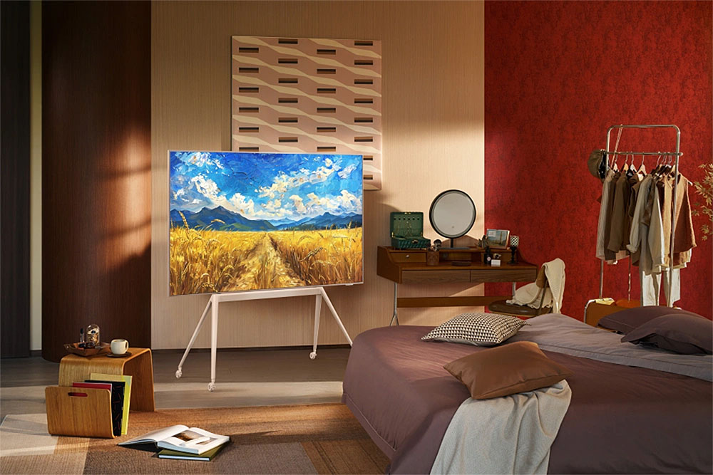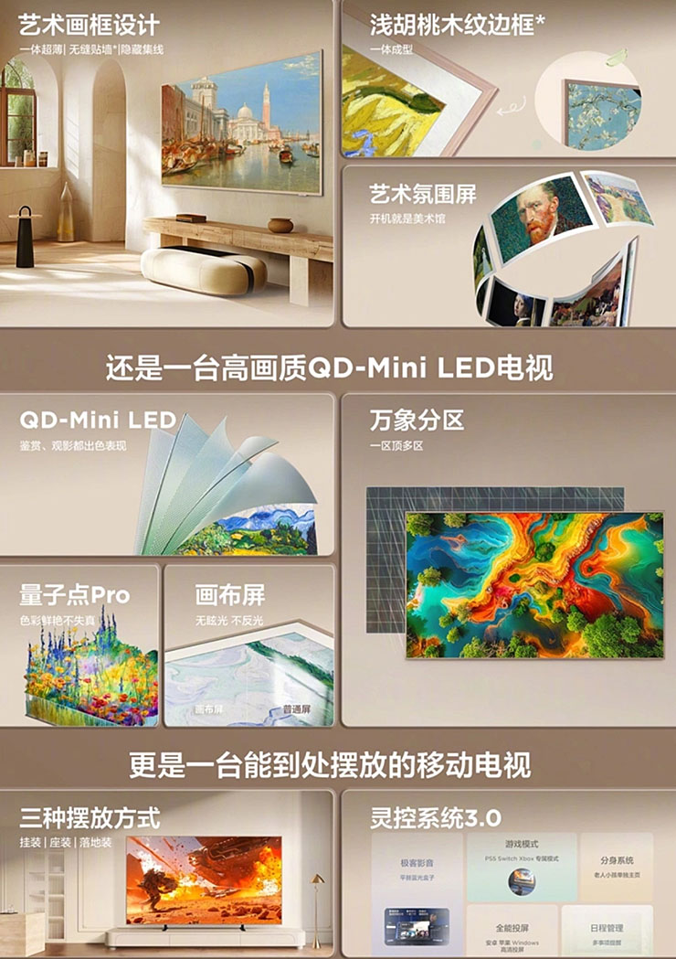 Côté Art TV, on remarque un mode Art enrichi avec plusieurs dizaines/centaines d’œuvres pré‑installées et un rendu visuel largement plus proche d'un tableau grâce au nouveau revêtement mat (référence AG25) et un encadrement de dalle décoratif. Avec les fonctions d'IA générative déjà présentes dans les TV TCL A300 Pro, on retrouve sur les écrans TCL A400 Pro la possibilité de créer des images thématiques ou des tableaux animés. Enfin, un pied sur roulettes a été présenté en Chine (cf. photos ci‑dessus), mais on ne sait pas s'il sera distribué en France.