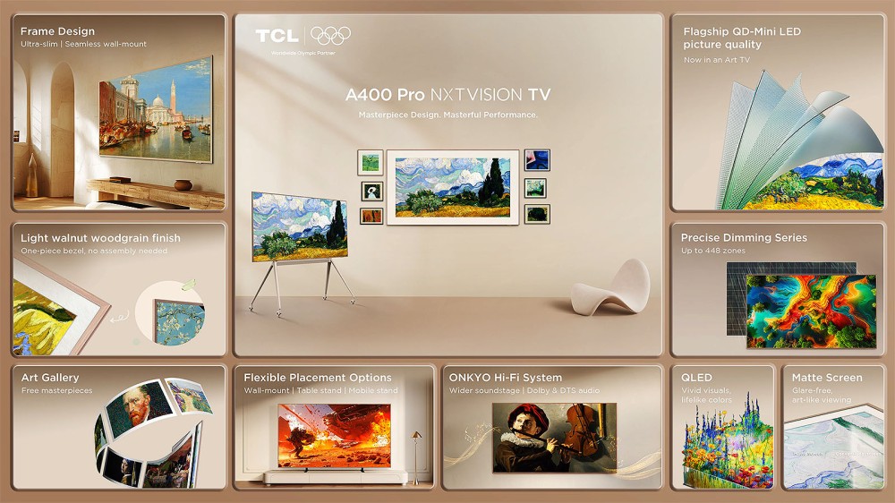 Côté Art TV, on remarque un mode Art Gallery enrichi avec plusieurs dizaines/centaines d’œuvres pré‑installées et un rendu visuel largement plus proche de celui d'un tableau grâce au nouveau revêtement mat (référence AG25), et à l'encadrement de dalle décoratif couleur chêne clair. Avec les fonctions d'IA générative déjà présentes dans les TV TCL A300 Pro, on retrouve sur les écrans TCL A400 Pro la possibilité de créer des images thématiques ou des tableaux animés. Enfin, un pied sur roulettes a été présenté en Chine (cf. photos ci‑dessus), mais on ne sait pas encore s'il sera distribué en France.