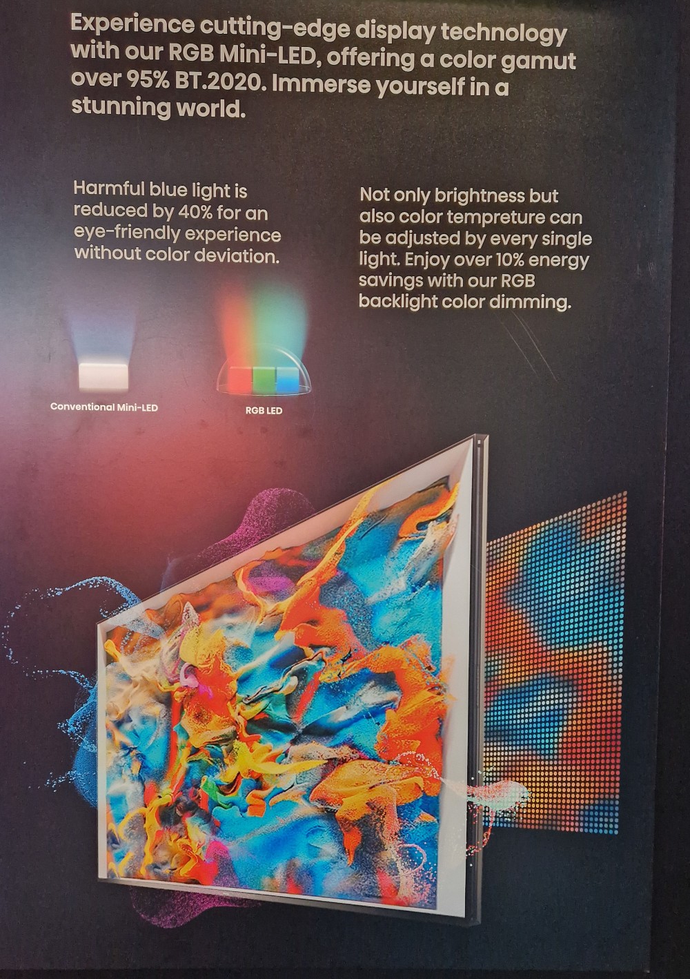 Concrètement, l’image délivrée présente des couleurs plus intenses et aux teintes plus riches et plus subtiles. Autre atout, le rendement énergétique d’un écran doté de la technologie RGB‑MiniLED est supérieur à celui d’un écran conventionnel. Un point qui s’explique d’une manière simple. Par exemple, si l’écran doit afficher un violet. Il lui suffit d’éteindre la LED verte du triplet RGB et ne conserver que le rouge et le bleu « allumés ». Tandis que, sur un écran de dimensions identiques mais à la technologie plus conventionnelle, les trois lumières, rouge, verte et bleue seront produites, puis le bleu sera masqué. Son émission se fait donc en pure perte, ce qui engendre une surconsommation inutile sur le plan du bilan énergétique global de l’équipement. Enfin, la technologie RGB‑MiniLED limite à son strict nécessaire l’émission de lumière bleu. Ce rayonnement nocif pour les yeux n’est présent que lorsque les couleurs de l’image à afficher font appel à du bleu. Rappelons que lors de l’utilisation d’un filtre quantique les LED bleues sont actives en permanence, ce qui peut engendrer une certaine fatigue oculaire lors de séances de visionnage prolongé.