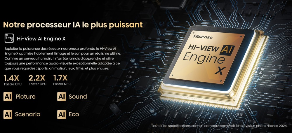 Reste que, pour bénéficier pleinement des atouts de cette nouvelle technologie, Hisense a dû concevoir une nouvelle puce de traitement du flux vidéo. Baptisée Hi‑View Ai Engine X, tout comme la technologie RGB‑MiniLED, elle dispose de ressources inédites. Plus précisément, il s’agit d’une puce de génération Pentonic 800 (les autres acteurs du marché n’en sont encore qu’au millésime 700). Cette nouvelle déclinaison de processeurs accroît sensiblement les capacités de traitement d’image et d’adaptation aux ambiances à restituer. Ce gain en performances atteint 50% notamment pour ce qui est du recours à l’intelligence artificielle. Pour tout ce qui est du domaine du Gaming, par exemple, les fonctionnalités relatives à la reconnaissance de la scène à l’écran, du contraste, et de l’Upscaling gagnent en efficacité. De même, pour un gain en fluidité, la dalle peut travailler jusqu’en 165 Hz en natif.