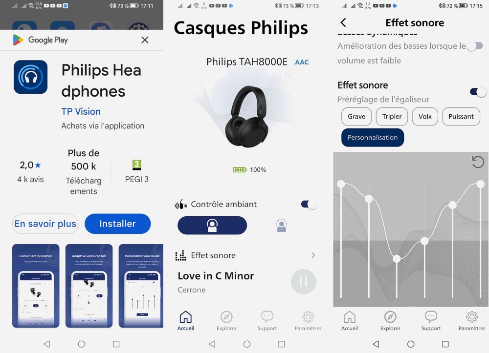Cependant, lors de la pratique d’un sport notamment,il peut s’avérer dangereux de se couper totalement des bruits environnants, notamment lors de la pratique d’un sport par exemple. C’est pour cette raison qu’il est possible d’ajuster l’efficacité du dispositif d’insonorisation active d’atténuation des bruits ambiants tant depuis l’application Philips Headphones (cf. photo ci‑dessous), compatible avec le TAH8000E, que directement depuis les commandes que porte son oreillette droite. Nous avons trouvé le choix d’un micro‑joystick assez judicieux car, une fois familiarisé avec ce mode de commande, son ergonomie était au moins équivalente, voire meilleure, que celle des zones sensitives.
