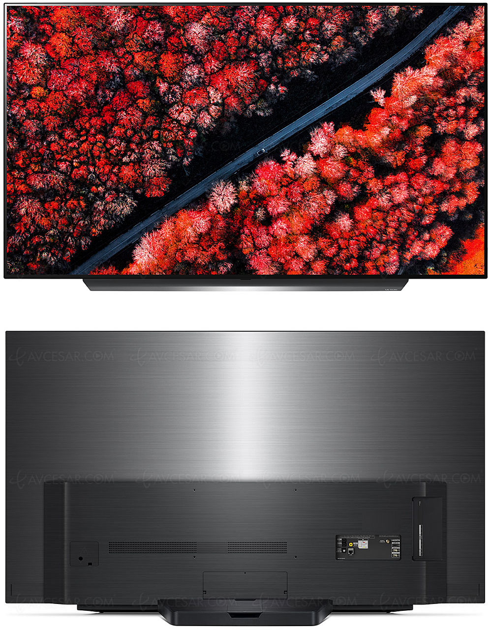 Rien à dire côté finition et assemblage qui profitent d'une qualité de fabrication rigoureuse. D'autre part, et à l'instar de la concurrence, le LG C9 dispose d'un nouveau filtre antireflet très efficace, parmi les meilleurs élèves de 2019. Même si de ce côté‑là Samsung fait clairement la course en tête avec son nouveau filtre révolutionnaire comme nous avons pu le découvrir lors du test du QE65Q90R (cliquez pour découvrir le test complet de la rédaction d’AVCesar.com). Comme vous pouvez l'apprécier sur la photo ci‑dessous, même le flash de notre appareil photo est très contenu. Bref, l’ensemble arbore un design en somme assez classique pour un téléviseur Oled, visuellement très réussi, sans cadre apparent et avec un large pied en aluminium brossé. Sans oublier une finition à 360° avec un revêtement du panneau arrière du TV, là encore du plus bel effet.