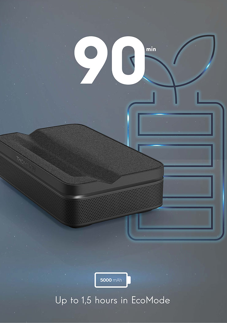 Facile à transporter, sensiblement de la taille d’une canette, le Thomson Go Project Vega, ultra‑compact et totalement autonome, est capable d’afficher une image dont la diagonale peut atteindre jusqu’à 2,50 m avec une définition Full HD. Sa batterie interne lui confère une autonomie de deux heures. Enfin, son système autofocus associé à une correction automatique de trapèze simplifie sa mise en service qui ne prend ainsi que quelques dizaines de secondes.