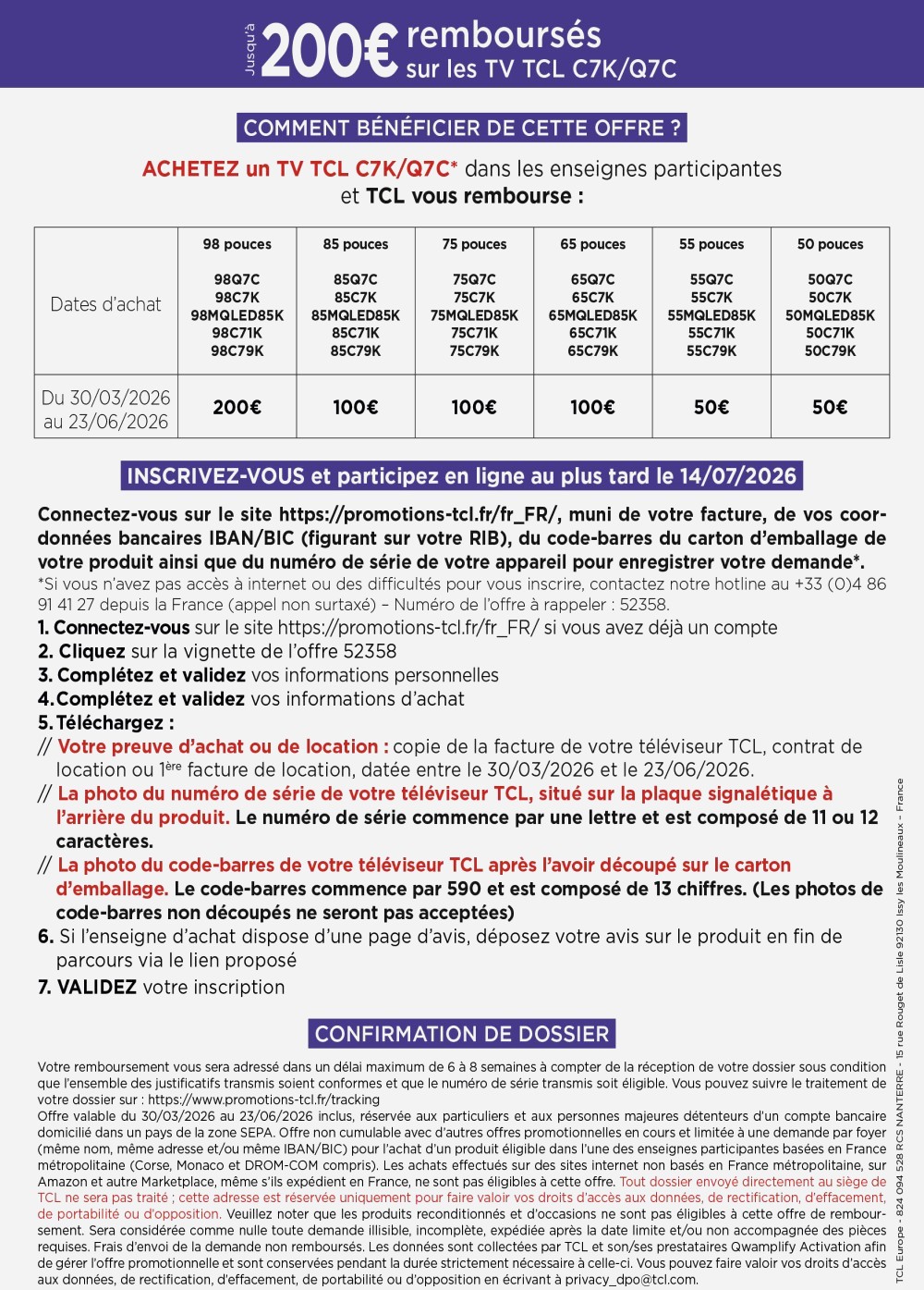 Jusqu'au 23 juin 2026, donc, pour tout achat d'un téléviseur Mini LED TCL C7K, TCL C71K, TCL C79K, TCL Q7C ou TCL MQLED85K parmi les modèles ci‑dessous, la marque vous rembourse :