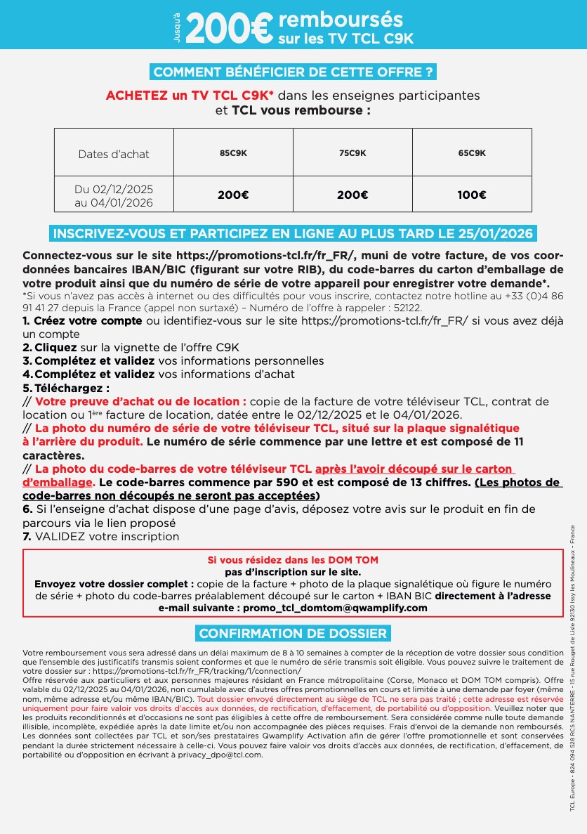 Jusqu'au 4 janvier 2026, donc, pour tout achat d'un téléviseur Mini LED TCL C9K parmi les modèles ci‑dessous, la marque vous rembourse :