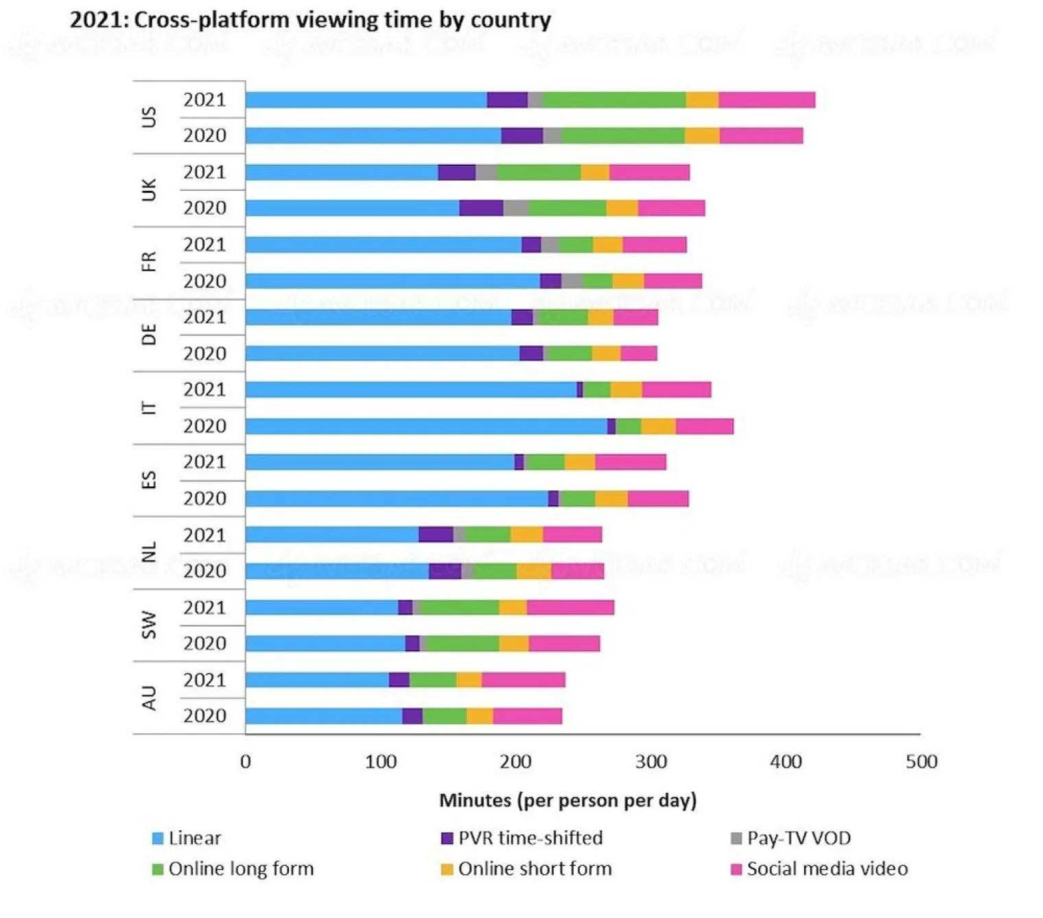 En 2021, tous types de vidéos confondus ont été regardés en moyenne 6 heures et 2 minutes par jour et par personne sur les trois continents étudiés, soit une petite baisse de 0,5% par rapport à 2020. Cette descente est notamment due au déclin de la TV linéaire, mais aussi des vidéos courtes et de la VOD. La baisse est toutefois compensée par la hausse du streaming et des vidéos des réseaux sociaux.